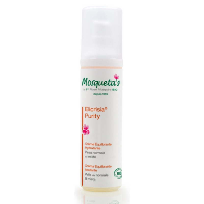 L'Emulsion rééquilibrante à l'Hélichryse et à La Rose Musquée Elicrisia Purity, de la marque Mosqueta's, hydrate (les couches superficielles de l'épiderme), revitalise et permet de purifier votre peau (barrière cutanée).
