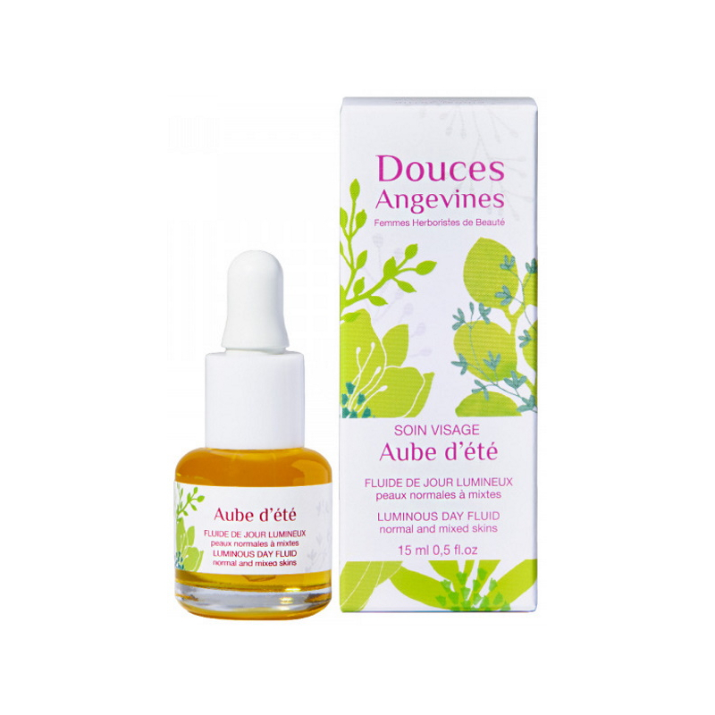 Les Douces Angevines Aube d'été Fluide de jour lumineux, rééquilibrant baume 15ml pour les peaux normales à mixtes.