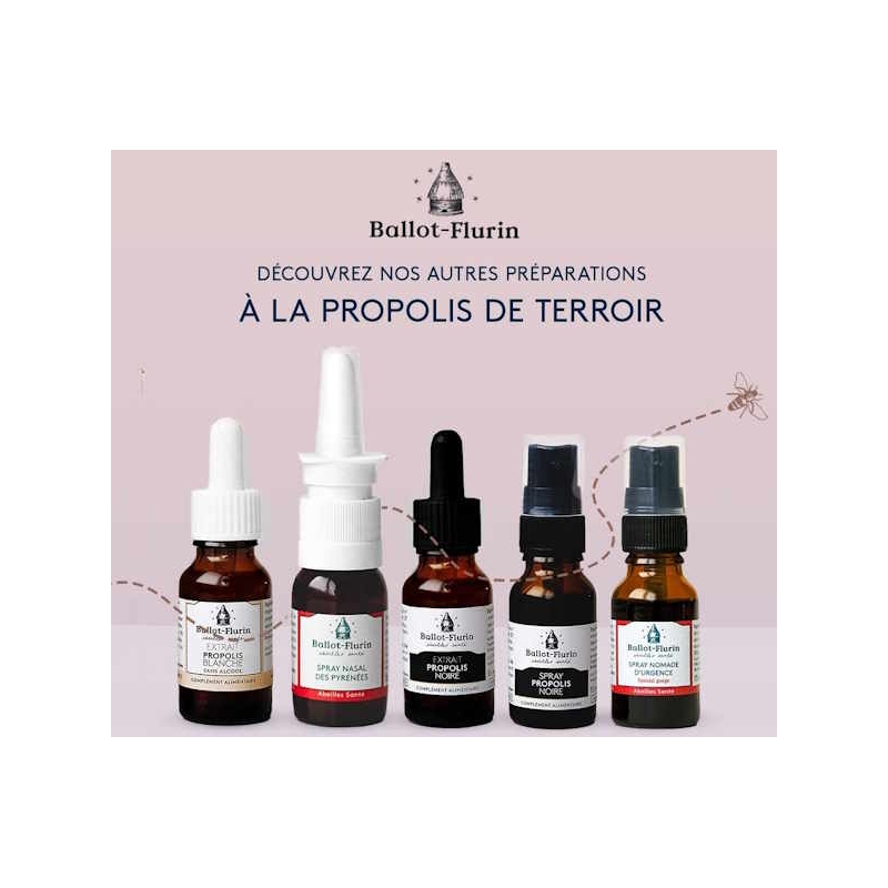 Pour votre gorge et avoir l'aide à la protection de l'organisme contre les agressions extérieures, on a choisi tout simplement, Ballot Flurin Spray Propolis noire française 15ml, pour des actifs comme l'extrait alcoolique de propolis noire et pure (eau de vie, propolis brute).