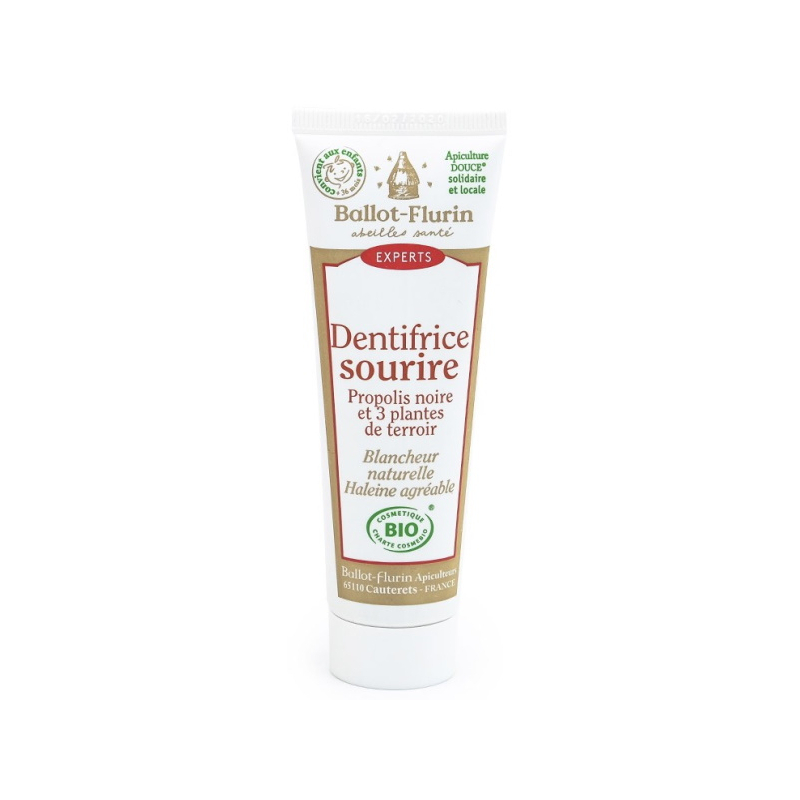 Son principal actif est la propolis, connue pour ses propriétés antibactériennes. Ce composant facilite le blanchissement naturel des dents sans avoir recours au polissage. Il fortifie les gencives et réduit la formation de plaques dentaires. La sauge, la mélisse et la menthe présentes également dans la composition procurent une sensation de fraîcheur. Ces composants actifs offrent une bonne haleine tout au long de la journée. Ce produit de la marque Ballot-Flurin est certifié cosmétique biologique par Ecocert et est labellisé cosmebio.
