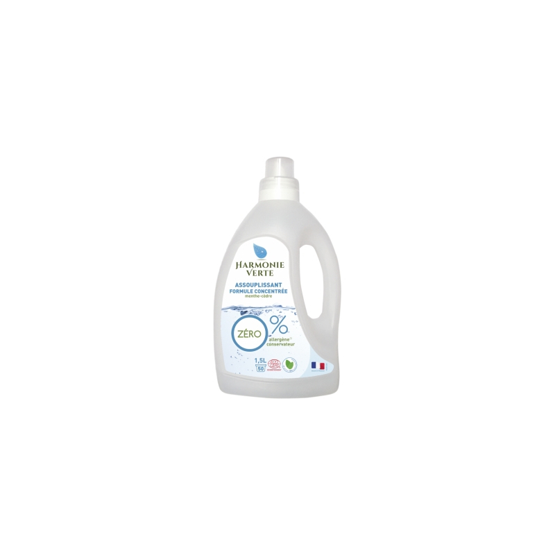 Assouplissant liste (des ingrédients) concentrée Menthe Cèdre, de la marque Harmonie Verte, nettoie avec efficacité grâce à sa liste (des ingrédients) concentrée, et hypoallergénique
