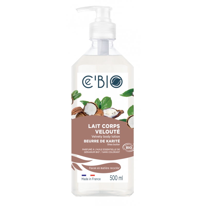 C'BIO Lait corporel velouté Karité 500 ml est le soin incontournable pour favoriser le bien-être de toute la famille. Il est formulé est à base de beurre de karité, ce qui lui permet de nourrir la peau. Ce soin hydrate les couches supérieures de l’épiderme et redonne à la peau toute sa douceur. Il ne laisse aucune sensation grasse et convient parfaitement pour un usage quotidien. Ce produit d’hygiène enveloppe la peau d’un agréable parfum et la rend plus douce et satinée.