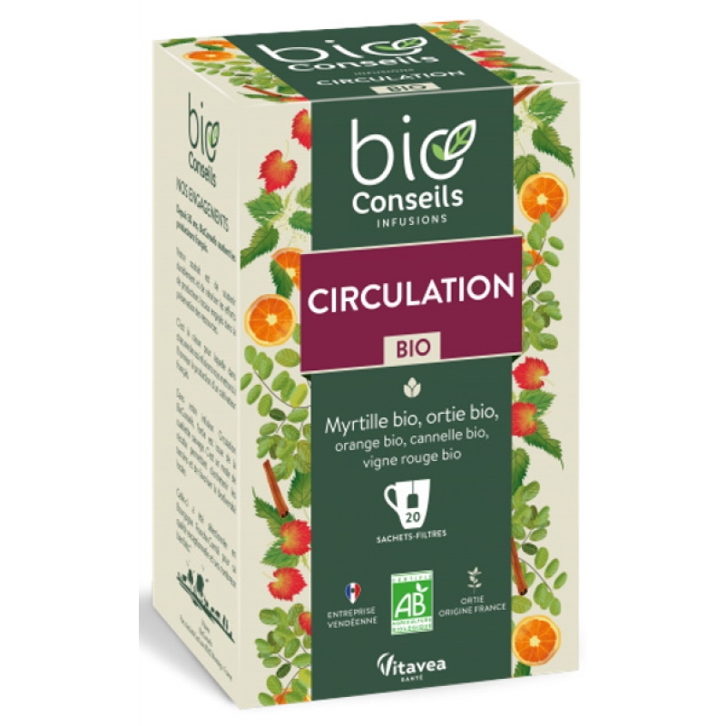 Bio Conseils infusion Circulation bio 20 sachets est un concentré de cinq actifs végétaux biologiques. La Vigne rouge est particulièrement idéale pour le confort circulatoire des veines grâce à sa teneur en anthocyanes. Enrichie en vitamines P et en pigments protecteurs, la Myrtille participe au bon fonctionnement des vaisseaux sanguins. L’Orange amère stimule la micro-circulation sanguine et l’activité du métabolisme digestif. Aux propriétés drainantes, les Feuilles d’Ortie améliorent la souplesse des vaisseaux sanguins en plus de stimuler l’évacuation des diverses toxines de l’organisme.