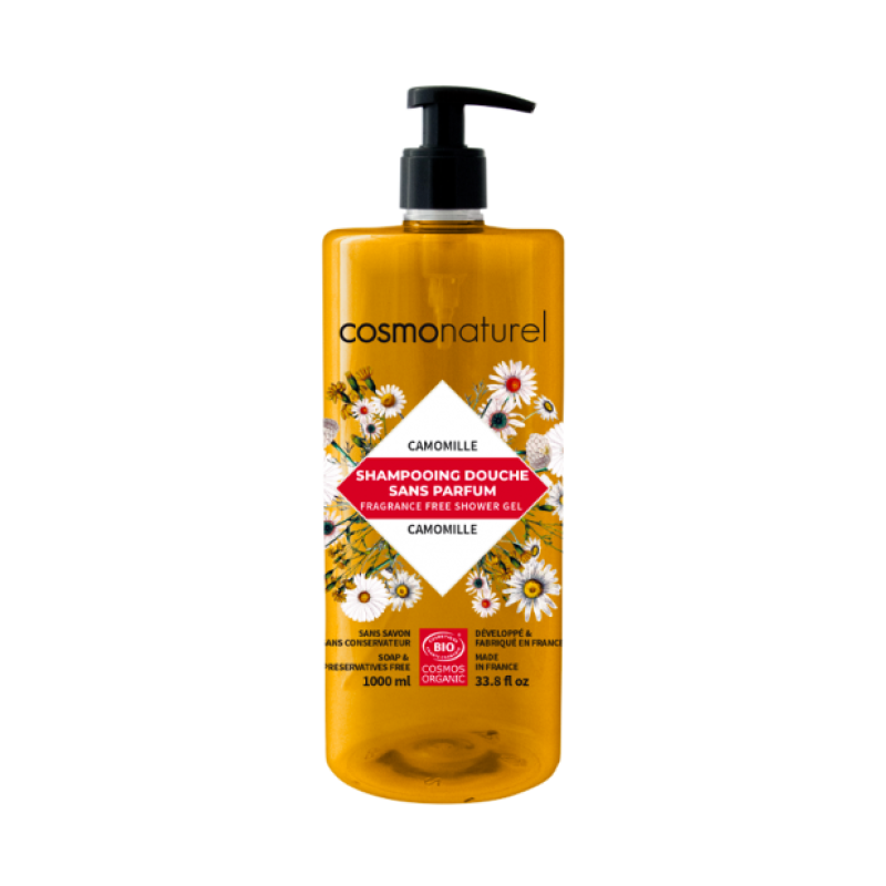 Cosmo Naturel Shampoing douche sans parfum à l'extrait de Camomille 1L apporte une base lavante végétale sans parfum et contenant de l'eau florale de camomille bio.