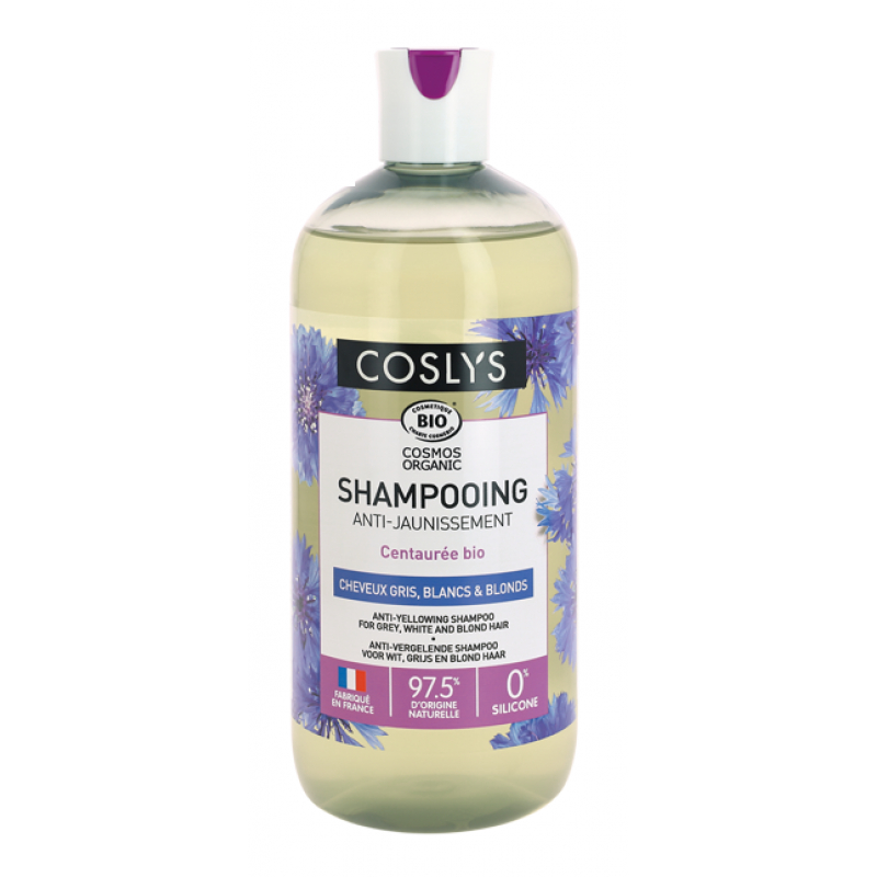 Coslys Shampoing anti jaunissement cheveux gris blancs et blonds Centaurée 500ml permet de raviver la brillance des cheveux blancs et gris avec l'extrait de centaurée bio.