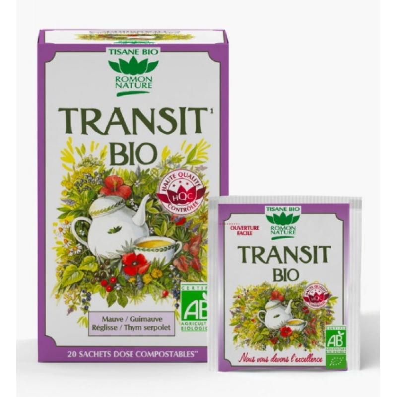 Romon Nature Tisane Transit Bio 20 sachets 32g aide à la régularité intestinale par la présence de mauve et de guimauve.