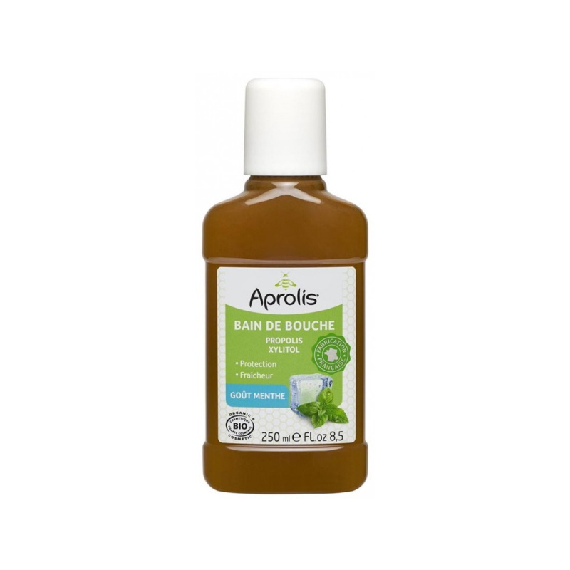 Aprolis bain de bouche Propolis et Xylitol goût Menthe 250 ml nettoie l’intérieur de la bouche naturellement et efficacement. Grâce aux actions antibactériennes et protectrices de la Propolis mélangée au Clou de girofle, les plaques dentaires et les gencives sont immunisées contre les bactéries. Le Xylitol aide à la prévention des caries dentaires tandis que le Calendula et la Camomille apaisent rapidement les inflammations au niveau des gencives. Ce produit pour bain de bouche combat également les mauvaises haleines grâce à la fraîcheur apportée par la Menthe poivrée et l’Eucalyptus.