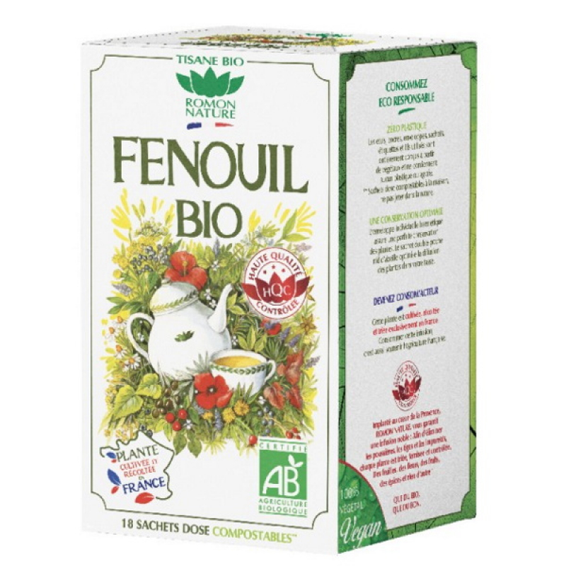la régularité de la digestion et la régularité de la motilité gastro-intestinale sont possibles par la tisane de fenouil bio, dans la tradition de production de Romon Nature, certifiés Non testé sur les Animaux, AB, Ecocert.