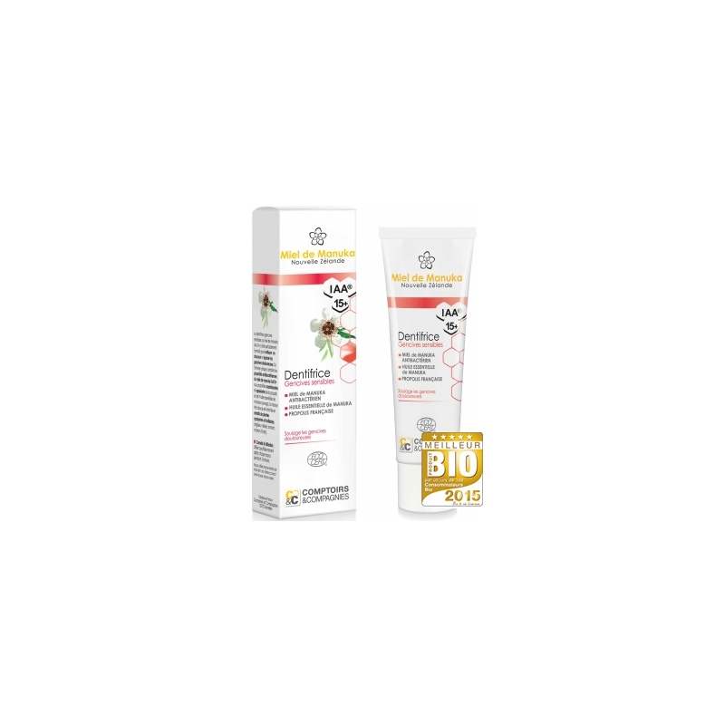 Le dentifrice bio gencives sensibles au miel de manuka IAA15+ a été spécialement formulé pour nettoyer en douceur et apaiser les gencives douloureuses. Sa formule unique combine les propriétés protectrices du miel de manuka IAA15+ aux propriétés assainissantes et apaisantes de la propolis bio française et de l'huile essentielle de manuka sauvage. Sa texture très douce est enrichie en extraits de plantes apaisantes et tonifiantes (réglisse, mélisse, romarin, marron d'inde).