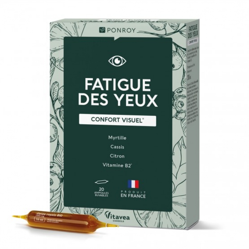 Bio Conseils 20 ampoules de 10 ml Fatigue des Yeux Myrtille cassis et citron sont des compléments alimentaires conseillés pour protéger la vue des personnes regardant souvent des écrans, des grands lecteurs et des conducteurs de nuit.
