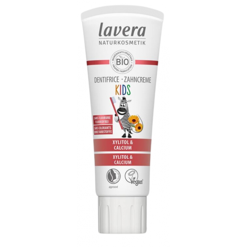 Lavera Dentifrice enfant Basis Fraise Calendula Calcium 75ml apporte une formule sans fluor pour l'hygiène des dents de lait.