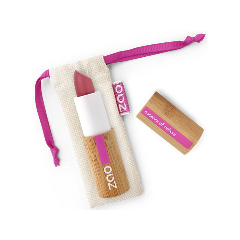 la mise en valeur de votre bouche et le confort des muqueuses sont possibles par ce rouge à lèvres rose nude, dans la tradition de production de Zao , certifiés Non testé sur les animaux, Ecocert, CosmeBio.