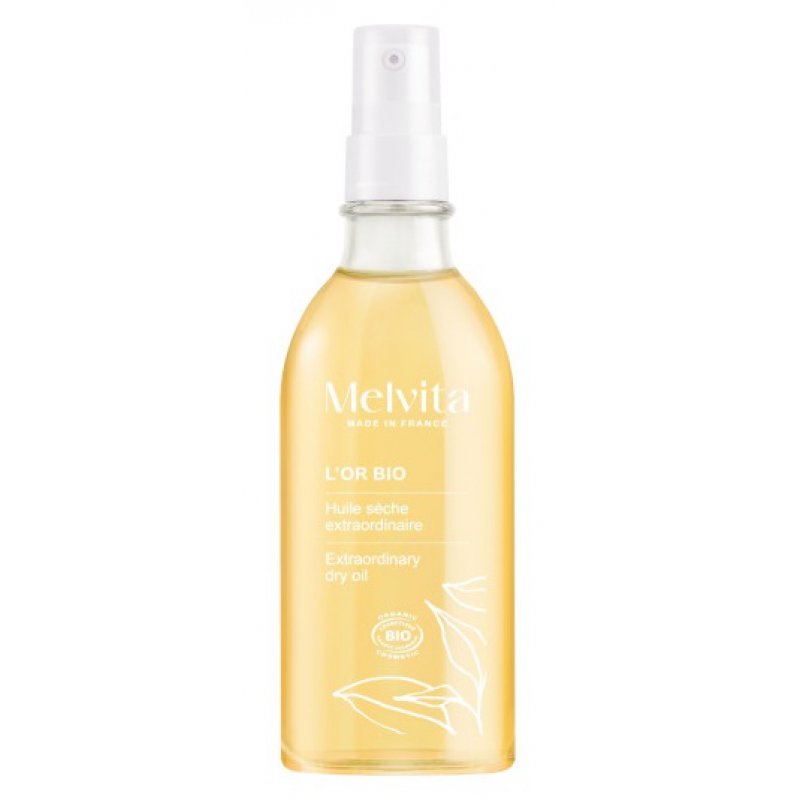 l'hydratation, la protection et la sublimation de la peau sont permis par l'Huile extraordinaire L'Or Bio (avec spray intégré), dans la plus pure lignée des produits de Melvita, certifiés Non testé sur les Animaux, Fabriqué en France, Cosmos Organic.
