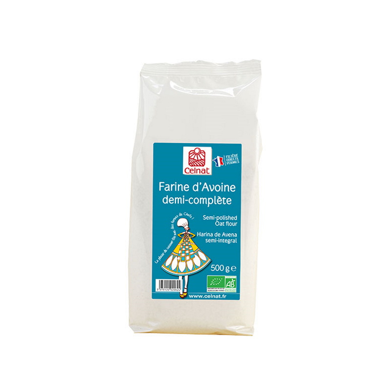 La farine d'avoine demi complète Celnat 500 g s’utilise seule ou en complément avec d’autres farines pour réaliser des crêpes, du pain, des gaufres et des gâteaux. Elle est particulièrement riche en fibres, en calories et en nutriments essentiels.
