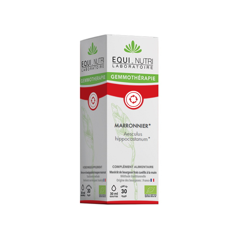 Pour votre organisme et avoir la protection générale par les flavonoïdes protecteurs et en accompagnant son action de massages cosmétiques avec un gel jambes légères, on vous propose tout naturellement, Equi - Nutri Marronnier bio Flacon compte gouttes 30ml, pour des actifs comme le marronnier d'inde bio de l'espèce Aesculus hippocastanum, dont on utilise les bourgeons.