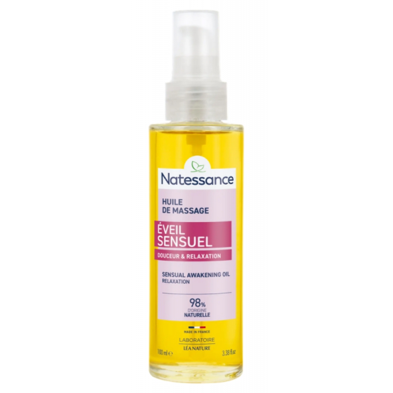 Huile de massage EVEIL SENSUEL Douceur relaxante Sillage de rêve, succombez à cet envoûtant élixir sensoriel qui vous couvre d'un subtil parfum aux notes voluptueuses et aphrodisiaques. La synergie de ces huiles offre à votre peau un véritable moment de détente qui vous invite à l'éveil et au plaisir des sens. La sensualité de son toucher soyeux, non gras, facilite le massage et prolonge le désir. Vertus adoucissantes et émollientes des huiles de sésame, d'amande douce et d'abricot. Effet non gras, non collant, Facilite le massage, Subtil parfum chaud et envoûtant, Invite à la détente et à la relaxation. Tous types de peaux. Formulé avec : Huile de sésame, huile d'amande douce et huile d'abricot. 78% d'huiles végétales 0.1% vitamine E naturelle 98% ingrédient d'origine naturelle Ingrédients : Glycine Soja (Soybean) Oil, Isopropyl Palmitate*, Sesamum Indicum (Sesame Seed) Oil, Prunus Amygdalus Dulcis (Sweet Almond) Oil, Prunus Armeniaca (Apricot) Kernel Oil, Parfum (Fragrance), Helianthus Annuus (Sunflower) Seed Oil, Tocopherol, Linalool, Coumarin, CI 75120 (Annatto), Ascorbyl Palmitate *Huile d'origine naturelle apportant un toucher sec Huile végétale Vitamine E naturelle Parfum synthétique Colorant naturel Vitamine E, anti-oxydant naturel Acides gras essentiels Sans colorant de synthèse Sans conservateurs de synthèse Formulée sans : paraben, paraffine, phenoxyethanol, silicone, phtalate Sans OGM Testé sous contrôle dermatologique Huile de massage EVEIL SENSUEL