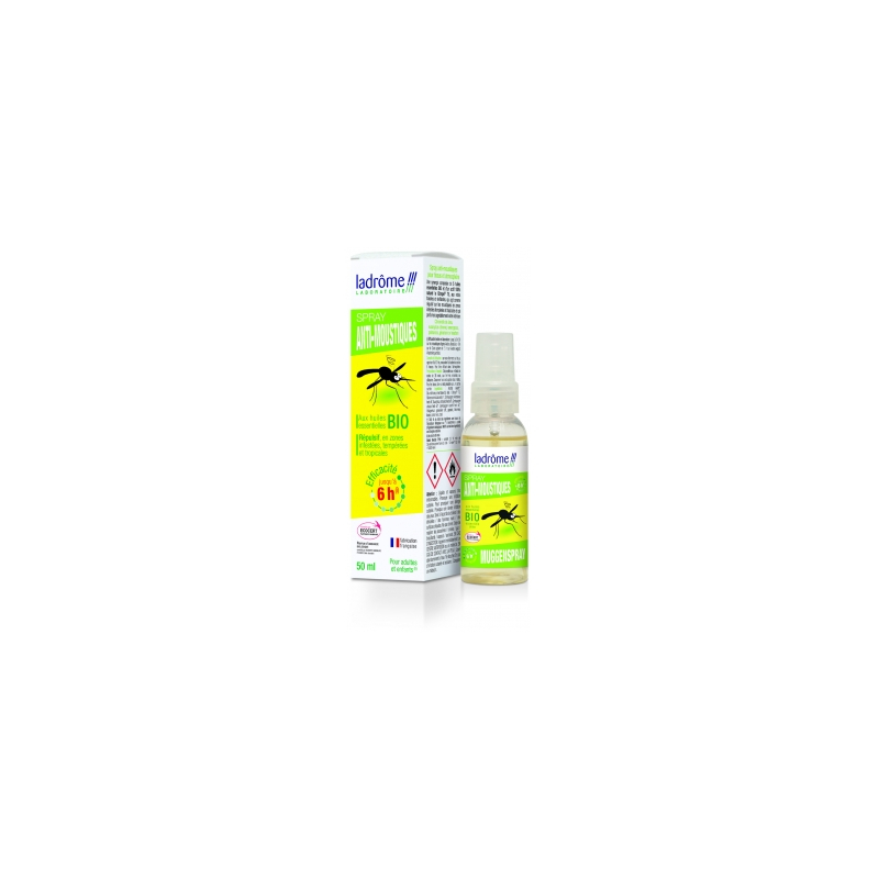 Spray Anti Moustiques 50 ml LadrômeRépulsif, en zones infestées, tropicales et tempérées.Efficacité jusqu'à 6h testée sur textile en laboratoire :- 5,5h sur les moustiques tigres Aedes albopictus,- 6 heures sur le Culex pipiens,- 5 heures sur Aedes aegypti, Anopheles gambiae.Pour adultes et enfants à partir de 36 mois.Une synergie de 5 huiles essentielles bio : eucalyptus citronné, citronnelle de java, lemongrass, palmarosa, géranium bourbon.Utilisation :- Sur vos vêtements ou tissus (8 à 12 pschitt).- En diffusion dans l'atmosphère.Ingrédients / INCI :alcohol*, trans-p-menthane-3,8 diol/citrepel 75 *, ricinus comunis seed oil*,cymbopogon winterianus herb oil*, eucalyptus citriodora herb oil*, cymbopogon martinii herb oil*, cymbopogon citrzatus herb oil, pelargonium graveolens oil(*) Ingrédients issus de l'Agriculture Biologique .Spray Anti Moustiques 50 ml Ladrôme