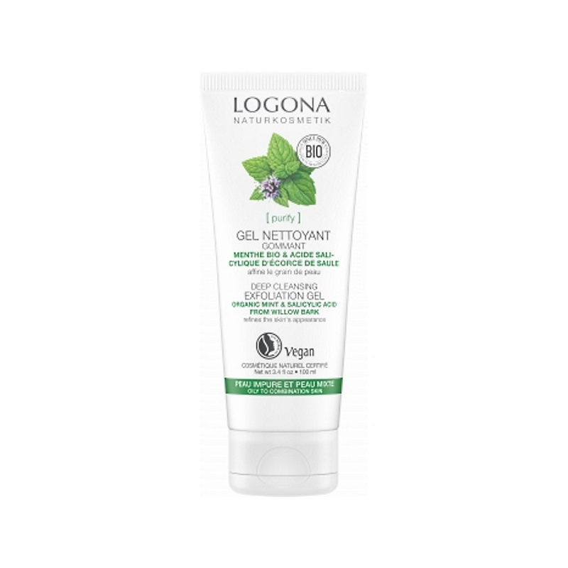 Logona Gel Nettoyant gommant Menthe bio et Acide salicylique d'écorce de saule Logona - Natrue et Vegan.