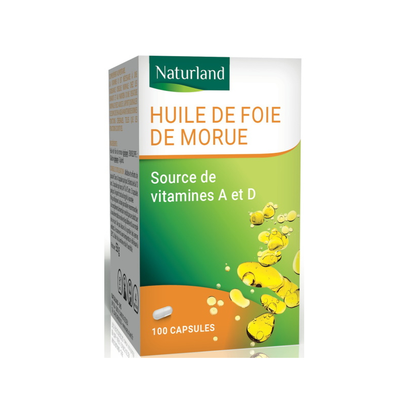 L'Huile de Foie de Morue 100 capsules de 400mg Naturland est un supplément alimentaire qui apporte 400 mg d'huile de foie de morue par capsule Végécap