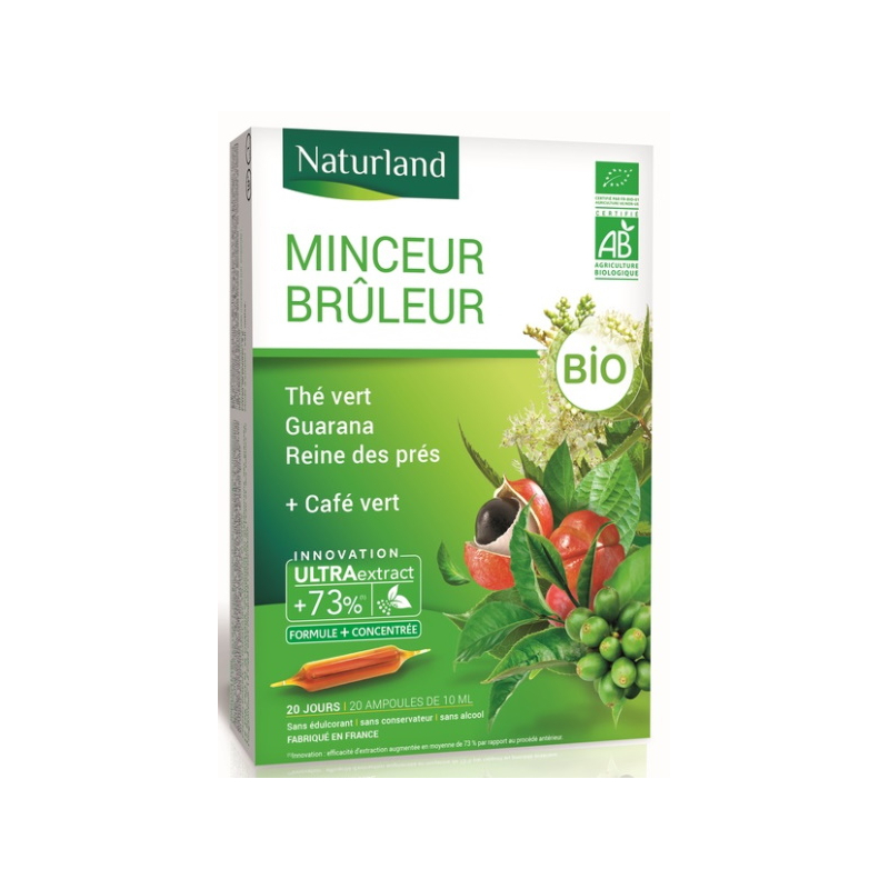 Naturland Minceur brûleur Thé Vert Café Vert guarana Reine des prés Bio 20 ampoules permet d'aider le métabolisme à plus brûler les surcharges localisées.