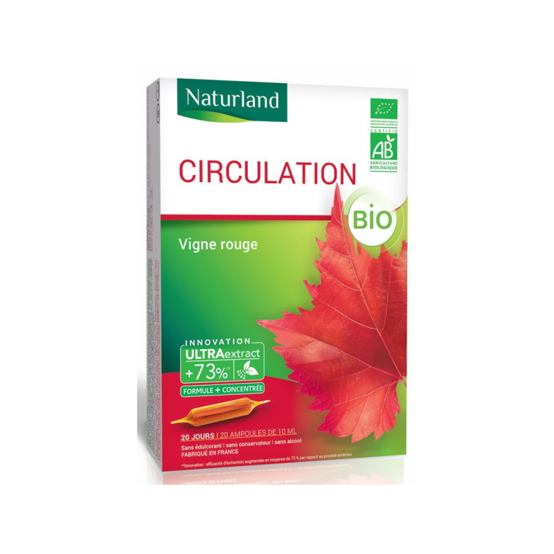 Naturland Vigne Rouge Bio 20 ampoules de 10 ml apporte un extrait aqueux concentré de feuilles de vitis vinifera.