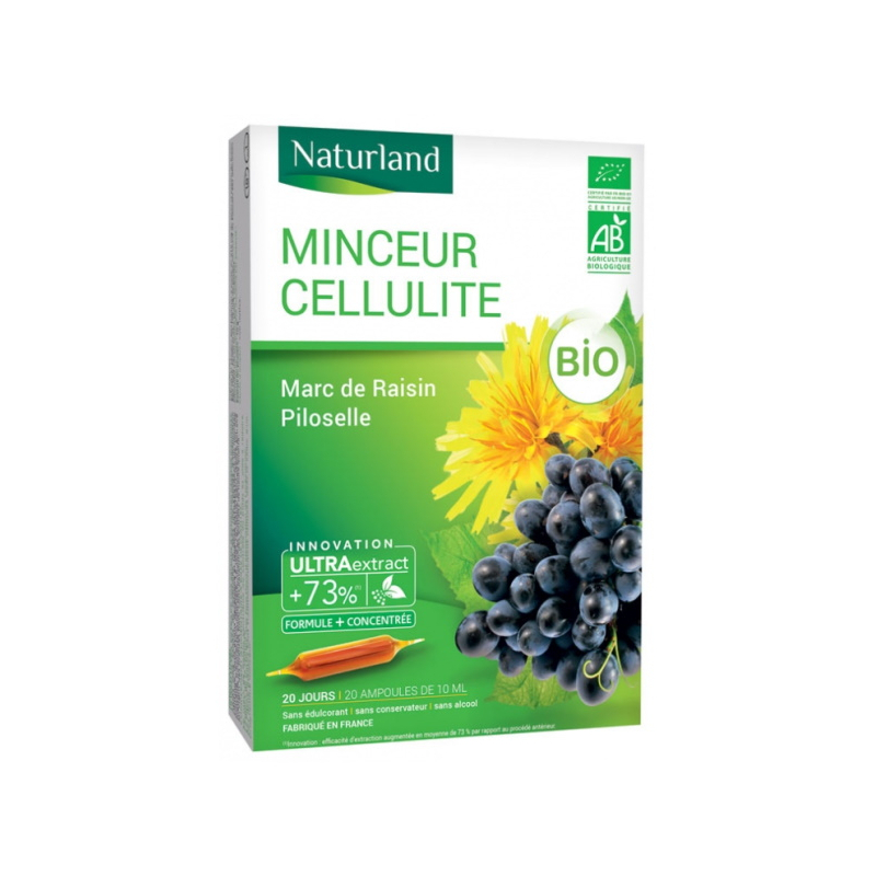 Pour votre organisme et avoir la mise en place d'une cure silhouette en prenant ce complément alimentaire sur des périodes de 3 semaines et en adoptant de nouvelles mesures alimentaires pauvres en sel, en sucre et en graisses saturées, on a choisi tout simplement, Naturland MINCEUR CELLULITE Marc de raisin Piloselle Bio 20 ampoules de 10ml, pour des actifs comme l'extrait de marc de raisin et l'extrait de piloselle.