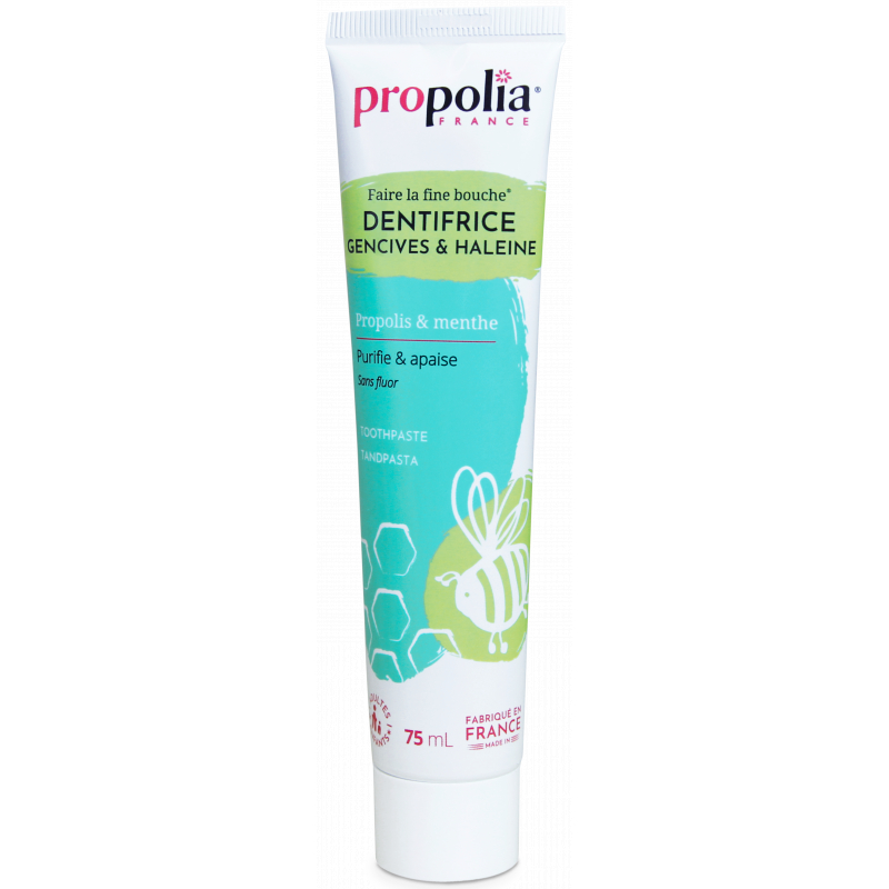 Dentifrice Propolis et Plantes PROPOLIA 75 ml est un dentifrice naturel contenant de la Propolis, des plantes médicinales et du Kaolin. Pouvoir purifiant de la Propolis assurant un nettoyage biologique intense sur les germes responsables de la plaque dentaire et des caries et procurant une haleine fraîche. Action légèrement abrasive du Kaolin atténuant les tâches de nicotine. Pouvoir calmant des extraits de plantes sur les gencives sensibles. Conseils d'utilisation : Se brosser les dents après chaque repas, et ceci au moins 2 à 3 fois par jour. Ingredients/INCI : Propolis purifiée 5%, Extraits végétaux de Cardamone, Céleri, Muscade et Anis vert, Huiles Essentielles de Menthe crépue et Menthe poivrée, Kaolin Dentifrice Propolis et Plantes PROPOLIA 75 ml