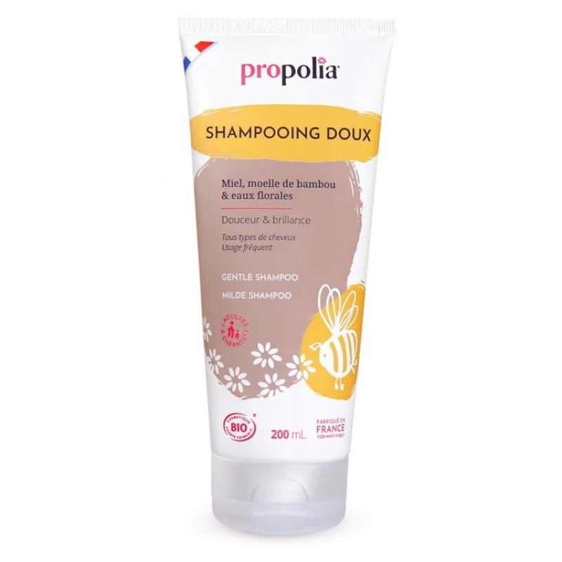 Pour que votre chevelure puisse avoir propreté et éclat, Propolia Shampoing Doux Bio être de mèche Miel et Bambou apporte de l'eau de fleur d'oranger, du miel, de l'eau florale de lavande, de la moelle de bambou, des extraits de saponaire et des huiles essentielles.