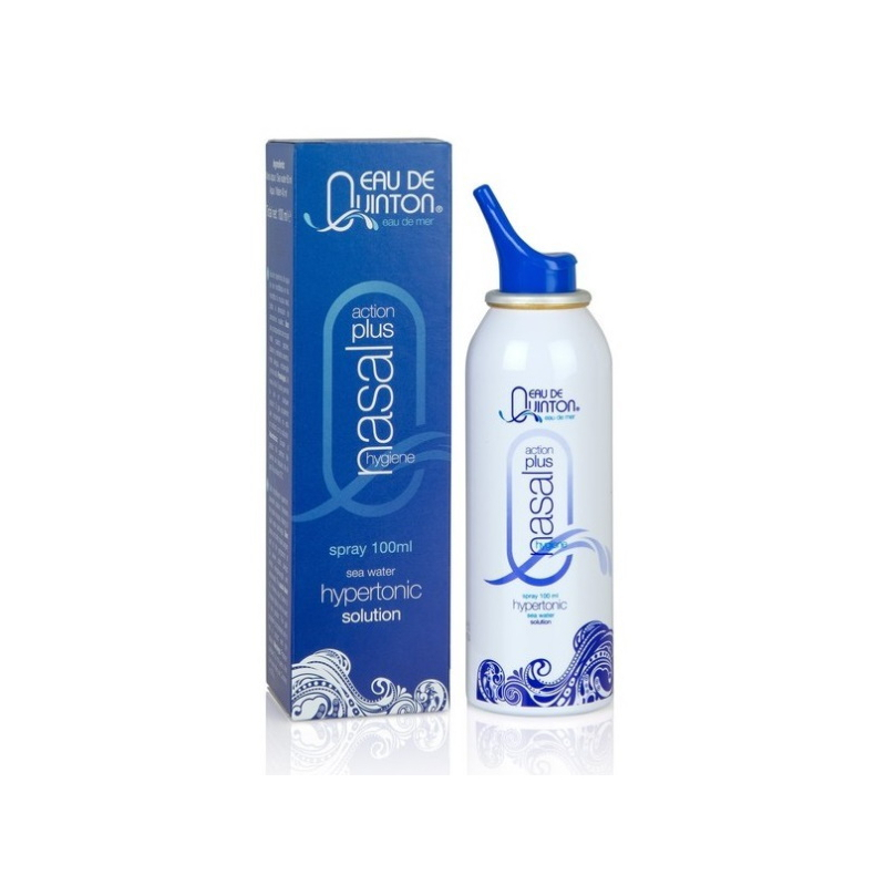 Pour votre nez et plus particulièrement vos voies respiratoires supérieures et avoir la désinfection de vos voies respiratoires et la stimulation de vos défenses naturelles, on vous propose tout simplement, Quinton Spray nasal Hypertonic Action Plus 100ml, pour des actifs comme l'eau de mer hypertonique.