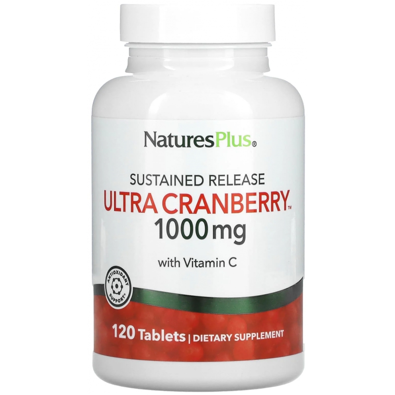 Nature's Plus Ultra Canneberge 1000mg 120 comprimés apporte un complexe associant Canneberge (Vaccinium macrocarpon), Vitamine C (naturelle), Genévrier (Juniperus communis), Persil (Petroselinum crispum), Trèfle rouge (Trifolium pratense), Busserole (Arctostaphylos uva-ursi).