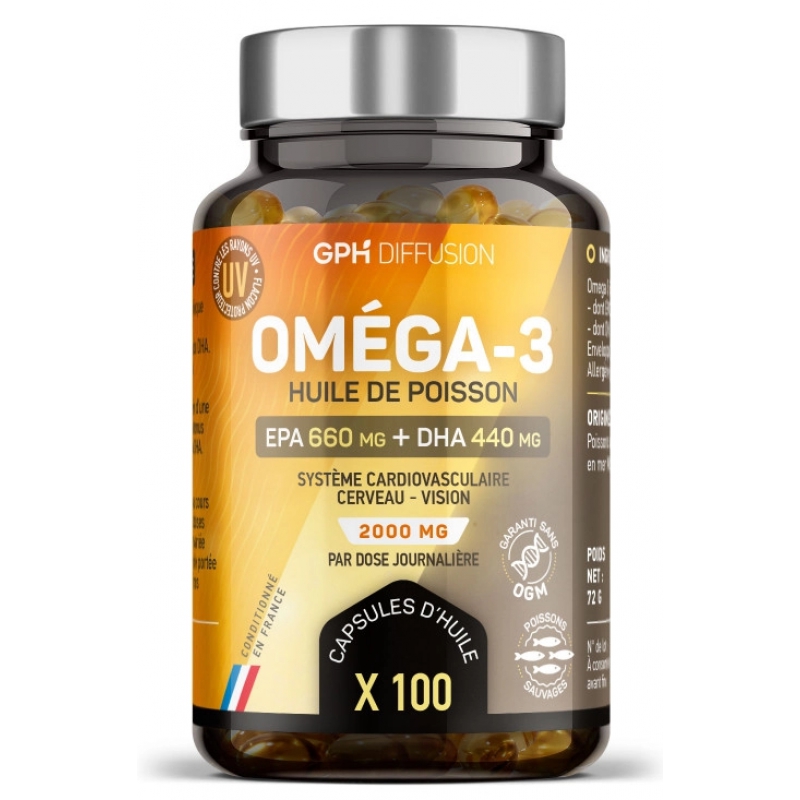Omega 3, 100 capsules, GPH Diffusion, permet de favoriser le bon fonctionnement de votre organisme humain.