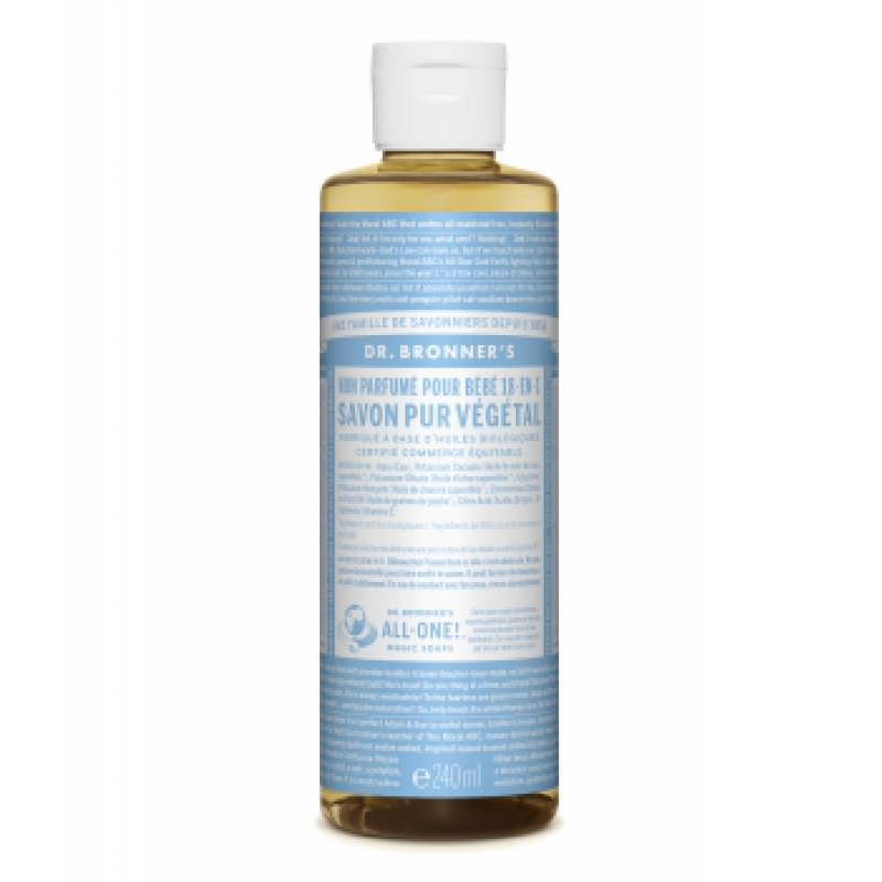 Le savon non parfumé pour bébé de Dr. Bronners ne contient aucune substance odorante et est un savon idéal pour les enfants, tout comme pour les personnes ayant une peau sensible ou souffrant d'allergies. L'huile de noix de coco biologique crée une mousse agréable et le mélange unique d'huile biologique d'olive, de chanvre et de jojoba de qualité élevée apporte aux peaux sensibles un soin naturel et l'hydratation dont elles ont besoin. Les savons ne contiennet aucun agent moussais, épaississant ou de conservateur. Ils moussent uniquement grâce à la combination exceptionnelle d'ingrédients naturels, qui provient d'une expérience forte de 150 ans. Aussi bon pour le corps que pour l'environnement, avec Dr. Bronners vous avez la possibilité de contribuer chaque jour au bien être de la planète.