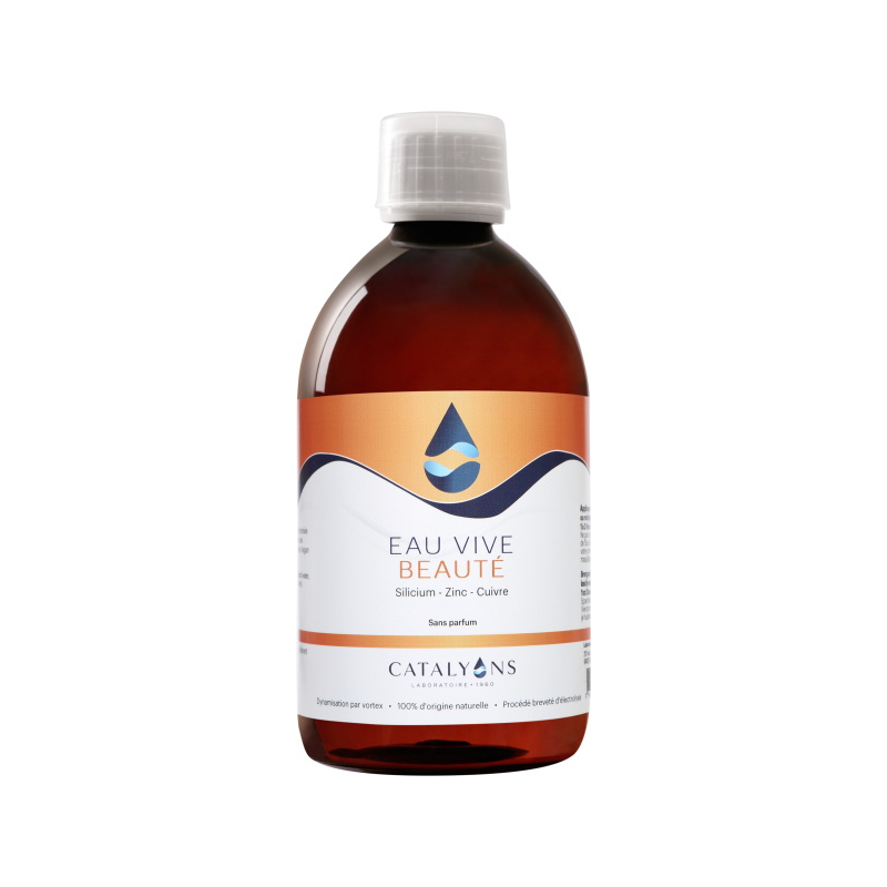 L’eau vive Beauté de la Peau 500 ml Catalyons est un concentré d’oligo-éléments servant à tonifier la peau et à la protéger des agressions externes. Ce produit convient particulièrement aux peaux sujettes à des affections telles que l’eczéma, l’acné ou le psoriasis. Son apport en zinc lui permet d’assurer le bon fonctionnement des cellules cutanées et de réguler la production de sébum. Le silicium agit comme un complexe anti-âge, en plus de stimuler la production de collagène. Le cuivre est idéal pour atténuer les pigmentations et pour lutter contre les infections de peau. La chlorophylle vient enlever les impuretés cutanées et stimuler le renouvellement cellulaire.
