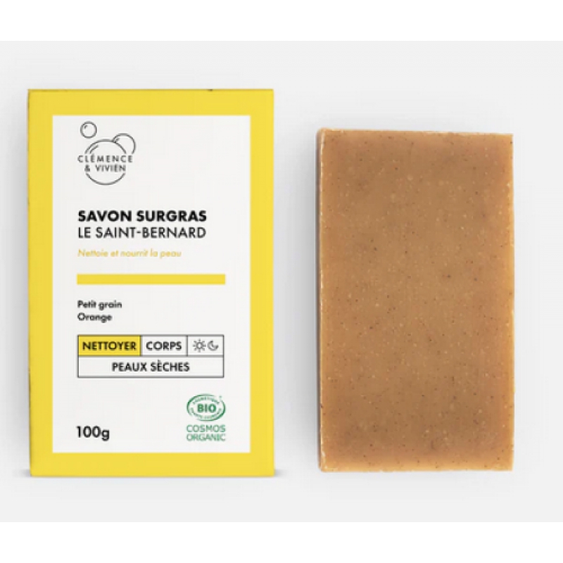 Le Savon à froid Le Saint Bernard Nourrissant, de la marque Clemence et Vivien, permet d'apaiser, hydrate (les couches superficielles de l'épiderme)r, nourrir et de cicatriser les peau (barrière cutanée)x fragiles.