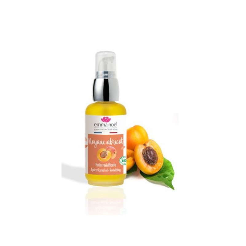 Huile aux noyaux d’abricot à l’action revivifiante, mise en flacon de 50ml par la maison Emma Noël