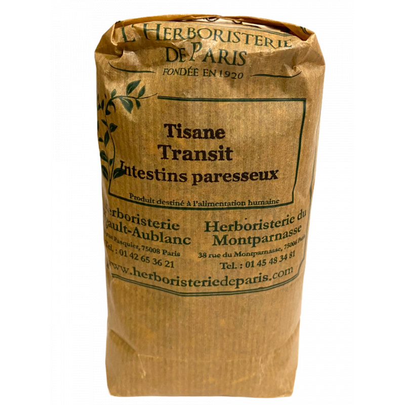 Herboristerie de Paris Tisane Transit, Intestins paresseux 120g aide à stimuler le transit trop long par l'apporte de mucilages, de fibres et d'actifs stimulants doux.