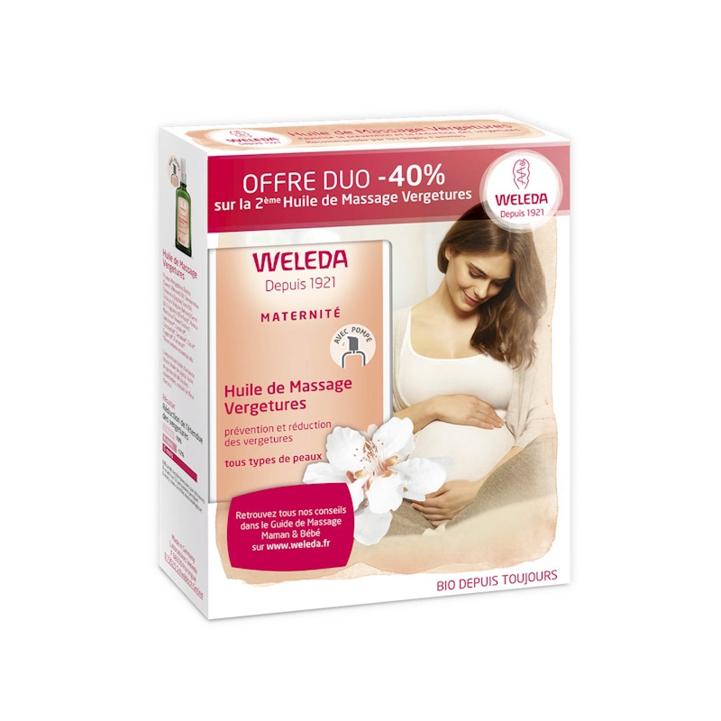 Pour répondre aux besoins spécifiques de la femme enceinte, Weleda a créé l'Huile de Massage Vergetures à base d'huiles d'amande douce, de jojoba bio et de germe de blé naturellement riche en vitamine E et enrichie en extrait d'arnica bio.