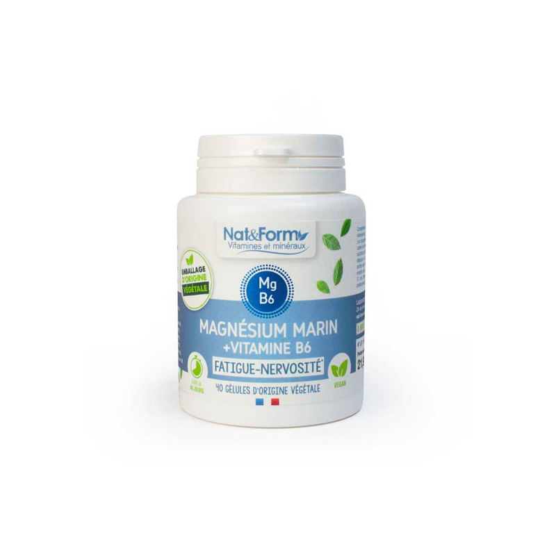 Nat et Form Magnésium marin Vitamine B6 40 gélules permet d'équilibrer le système nerveux normal et participe à plus de 200 réactions chimiques du métabolisme.