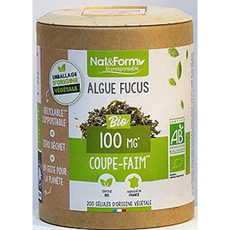 Nat et Form Algue Fucus Bio 200 gélules apporte 100mg de thalle de fucus pour la prise journalière de 1 gélule.