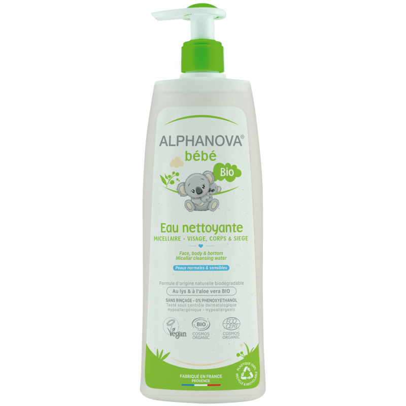L’eau nettoyante 500 ml d’Alphanova permet de nettoyer délicatement le visage et le corps. Ce produit particulièrement destiné aux peaux sèches et sensibles convient aussi bien aux bébés qu’aux adultes.