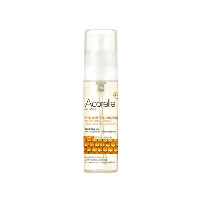 Acorelle Soin Anti Poils incarnés 50ml est un cosmétique traitant bio spécial poil incarné, pour le corps, à base d'extrait de miel et d'arginine.