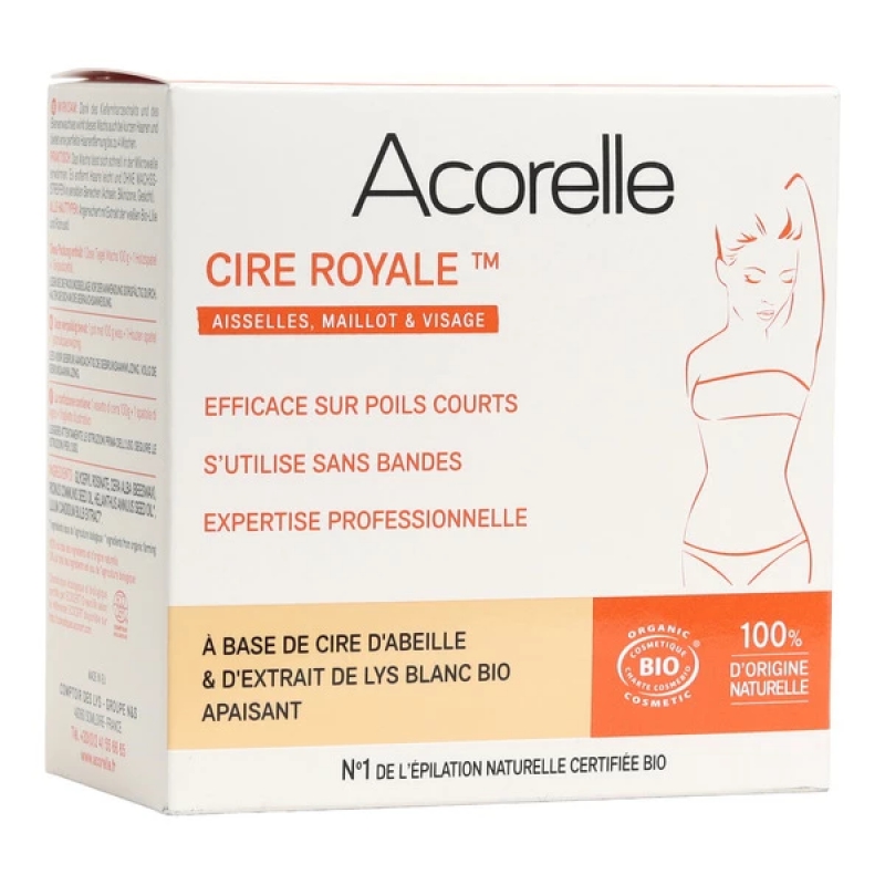 Formule exclusive à base de résine de pin et cire d'abeille pour une efficacité poils courts. La cire royale Acorelle est certifiée Ecocert et labélisée bio. Idéale pour une épilation en douceur, elle contient de la cire d'abeille bio et un extrait de lys blanc bio aux propriétés apaisantes et protectrices.