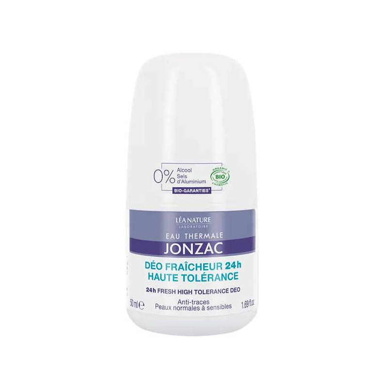 Eau Thermale de Jonzac Déo fraicheur 24H Haute Tolérance 50ml permet d'aider à contrôler avec des actifs naturels, la transpiration excessive et les mauvaises odeurs qui y sont liées.