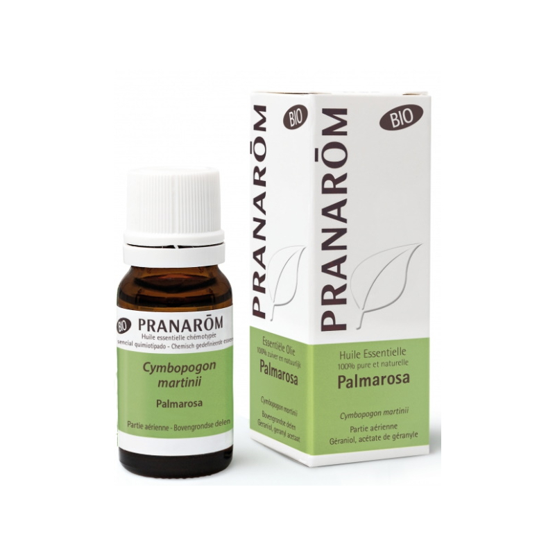 Le Palmarosa Bio Flacon compte gouttes, de la marque Pranarôm, et permet de soigner les problèmes de peau (barrière cutanée), respiratoires, et contribue à éliminer le stress.
