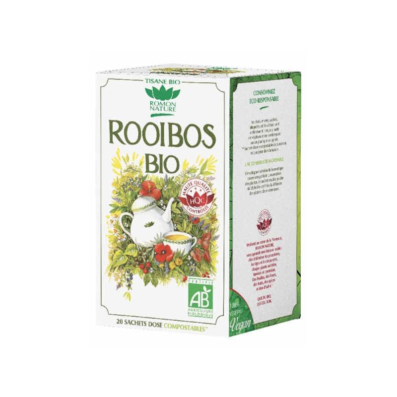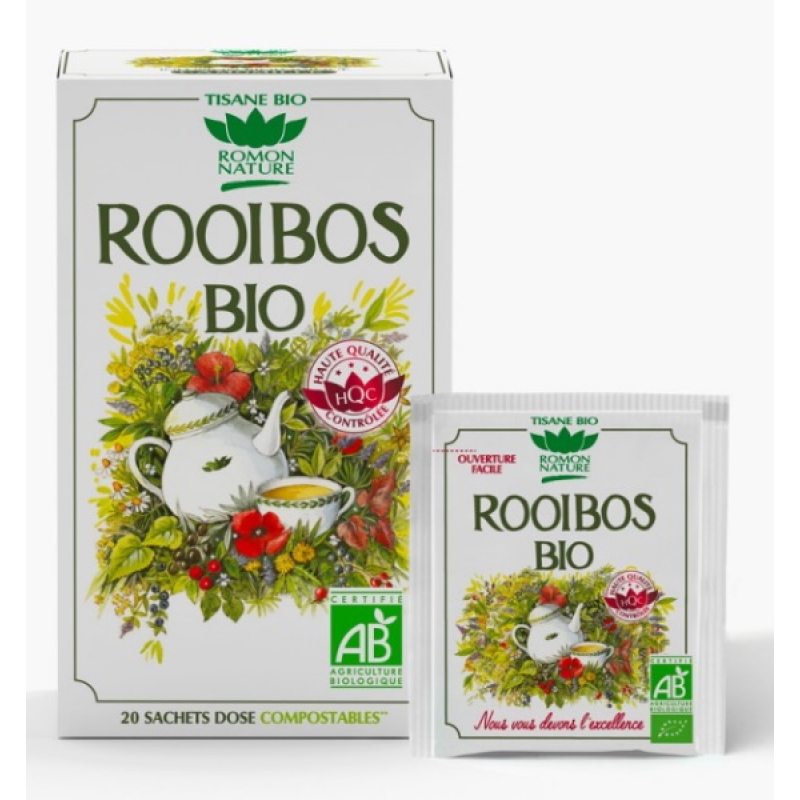 Pour votre organisme et avoir l'apport d'un thé d'exception, traditionnement consommé en Afrique du Sud et sans théine et sans caféine, on a choisi tout naturellement, Romon Nature Tisane Rooibos bio 20 sachets, pour des actifs comme les feuilles de rooibos rouge d'Afrique du sud (espèce Aspalathus linearis).