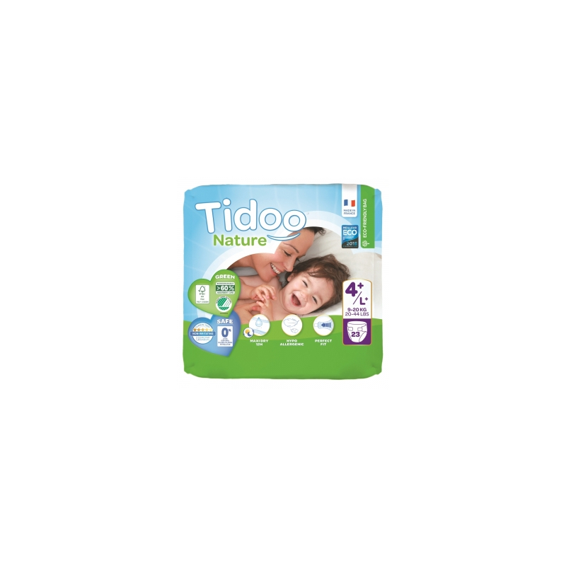 Pour la propreté de votre bébé et avoir protection et sécurité contre les fuites, on a choisi tout naturellement, Tidoo 23 Couches Single Pack (T4+/L+) 9/20kg x23, pour des actifs comme le coton bio certifié sans blanchiment au chlore.