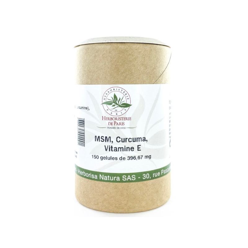 Pour soutenir votre organisme et avoir l'action antioxydante en fournissant du soufre au système glutathion et par l'intermédiaire de la curcumine et de la vitamine E, on vous propose sans hésitation, Herboristerie de paris M.S.M Curcuma Vitamine E 150 gélules, pour des actifs comme le MSM (methyl sulfonyl methane) apportant du soufre à l'origine de la formation de composants articulaires et tendineux, d'extrait de curcuma standardisé à 95% de curcumine et de vitamine E antioxydante.