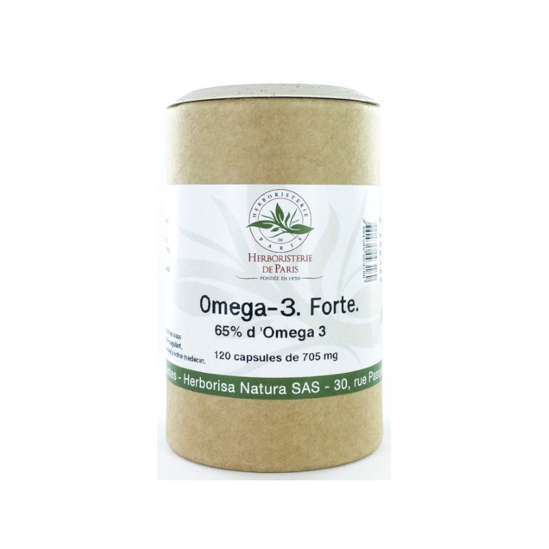 Herboristerie de Paris Omega 3 forte 65% 120 capsules de 705 mg apportent 1300mg Oméga 3 par jour pour la prise de 4 capsules dont les fameux acides gras essentiels EPA et DHA.