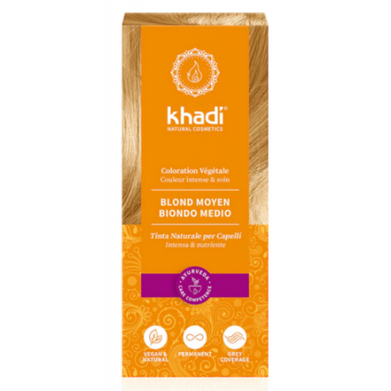 Khadi Coloration végétale Blond Moyen 100 gr permet de colorer les cheveux blonds avec une teinture blond moyen sans apporter de reflets blonds ou dorés.
