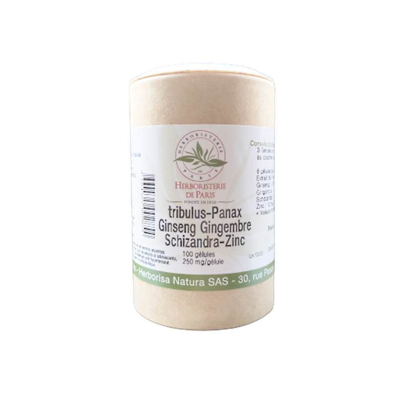 Herboristerie de paris Libido Tribulus Panax Ginseng Gingembre Schisandra Zinc 100 Gélules permet d'aider à apporter de la vitalité et de l'entrain à la vie de couple au niveau sexualité.